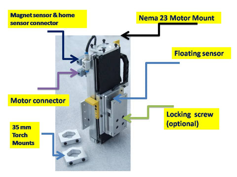 -Z axis lifter for plasma with double mount floating head and magnetic breakaway THC with 2 torch mounts, 35 mm.